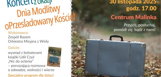 Kochani! Z okazji dnia modlitwy o Prześladowany Kościół, zapraszamy na wyjątkowy koncert, który odbędzie się 30 listopada o godz. 17:00 w Centrum Malinka. W programie: [...]