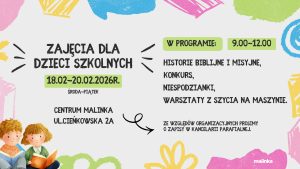 W dniach 18-22.02 (środa-piątek) w godz. 9:00-12:00 w Centrum Malinka, będą się odbywać zajęcia dla dzieci szkolnych. W programie: Historie biblijne i misyjne Konkursy i niespodzianki Warsztaty z szycia na maszynie Ze względów organizacyjnych prosimy o zapisanie dzieci w kancelarii parafialnej: tel. 789079379, mail: parafia@malinka.org.pl Zapraszamy!