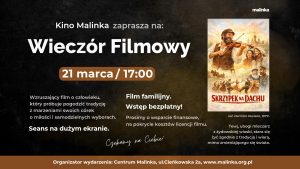 Kino Malinka zaprasza na kolejny Wieczór Filmowy. Już 21 marca w Centrum Malinka wyświetlony zostanie film „Skrzypek na dachu„. To swego rodzaj klasyka filmowa, opowiadająca historię ubogiego mleczarza z żydowskiej wioski, próbującego żyć zgodnie z tradycją i wiarą mimo zmieniającego się świata. Tym razem zaczynamy o godz. 17:00. W trakcie filmu planujemy krótką przerwę. Zapraszamy! […]